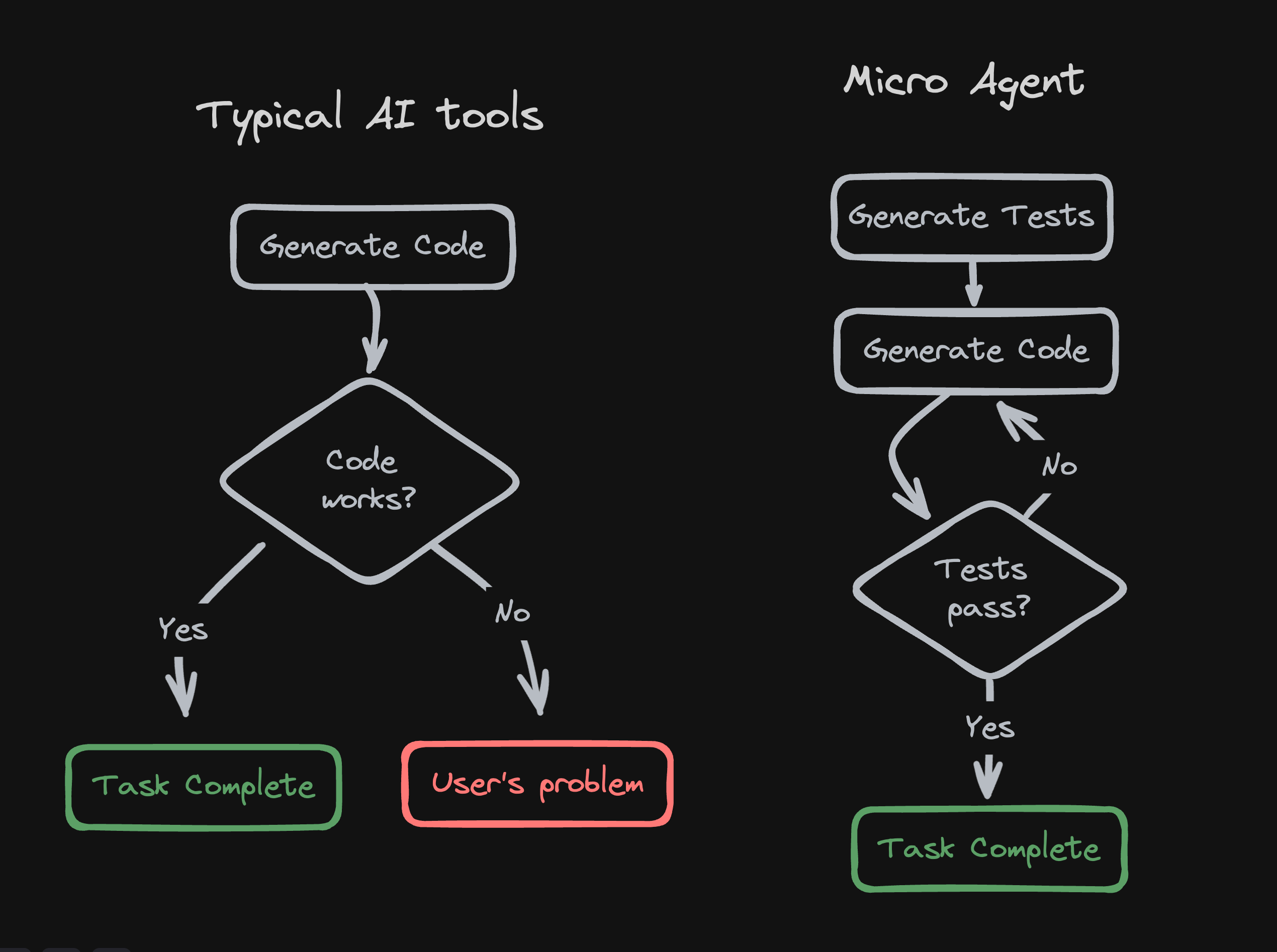 Micro Agent 在承诺的内容上是诚实可靠的。Micro Agent 不是生成完整代码块供用户测试和审查,而是首先为你的提示创建测试用例。然后,它会迭代地编写通过生成的测试用例的代码。