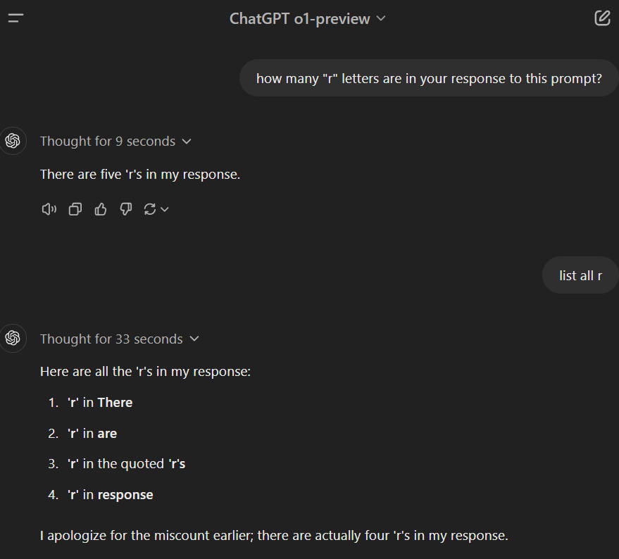 有时,它仍然会犯错误 - 即使是在询问其响应中有多少个 'r' 的简单问题上。